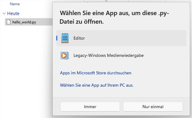 Falls sich folgendes Fenster öffnet, wählen Sie hier Editor aus und klicken Sie auf Nur einmal: