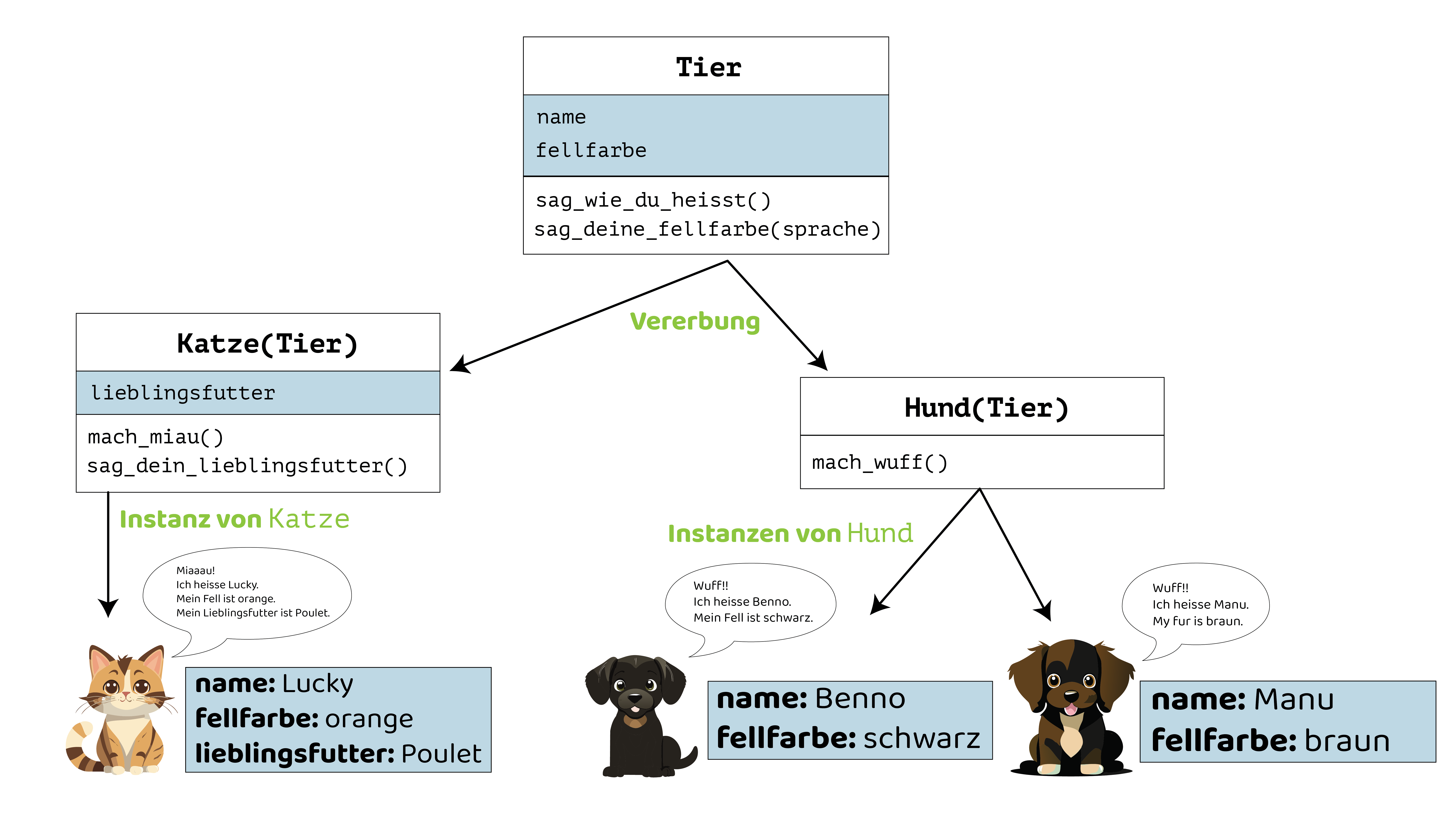 Tierdefiniert sind. Deshalb können wir den Zeilen38,39,42,46und47die Methodensag_wie_du_heisst()undsag_deine_fellfarbe()auf Instanzen vonHundundKatzeaufrufen, obwohl diese Methoden in der KlasseTierdefiniert sind (Zeilen6-13).